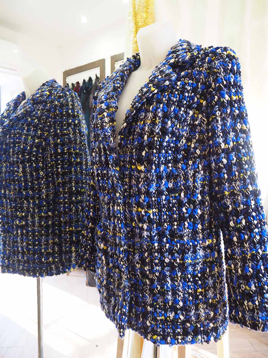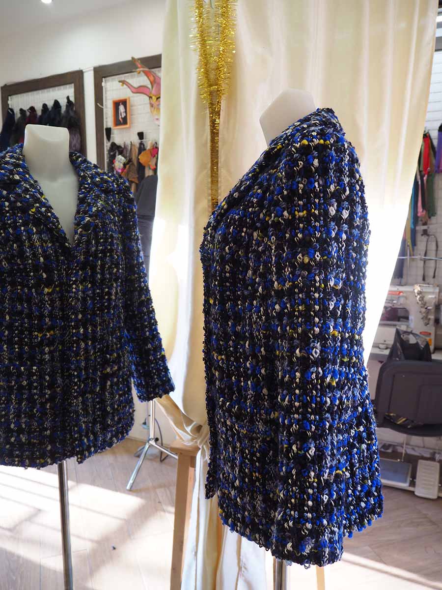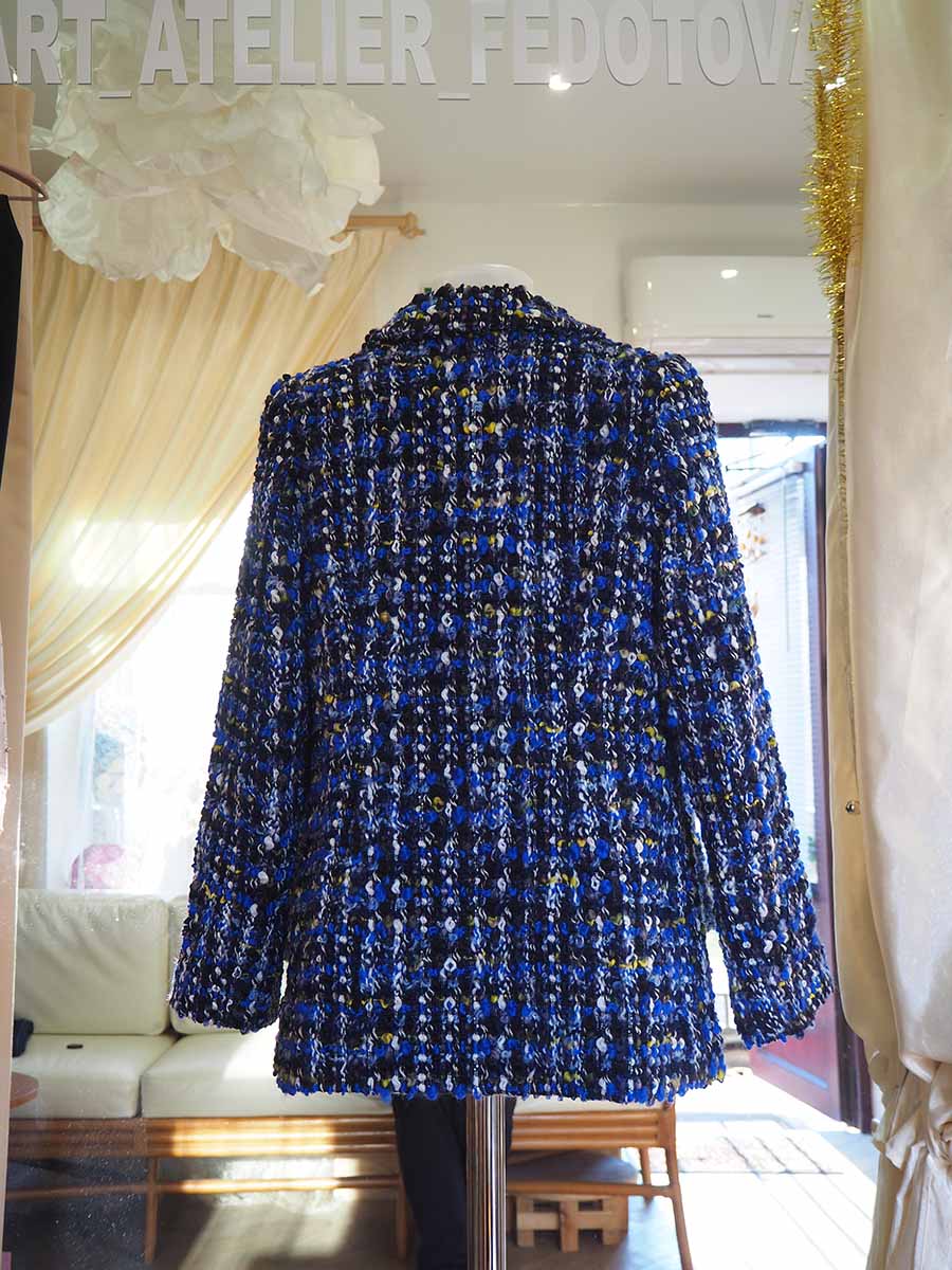 Женский жакет прилегающего силуэта с английским воротником. Ворот – это единственное отклонение от классической модели Шанель, которое мы позволили по желанию заказчицы, «классика» обычно его не имеет. Рукав прямой втачной, по полочке два накладных кармана, застежка на кнопках.