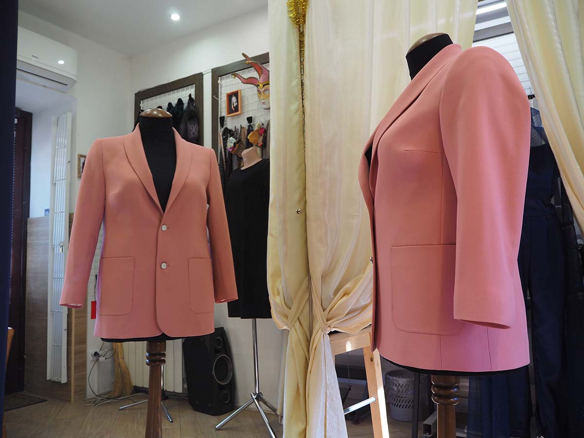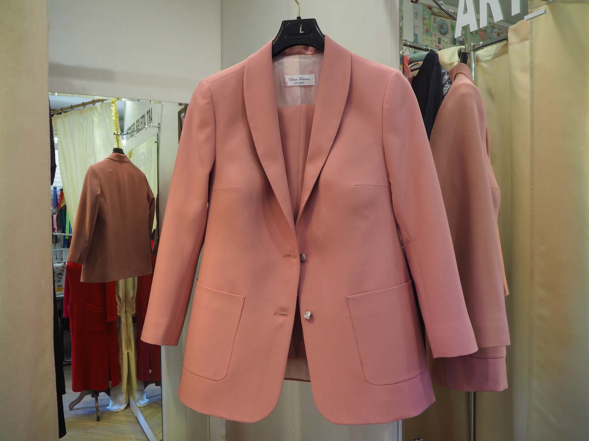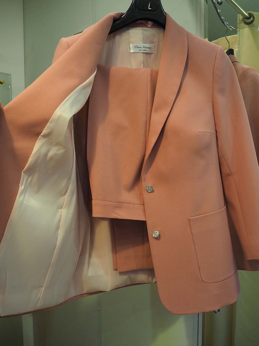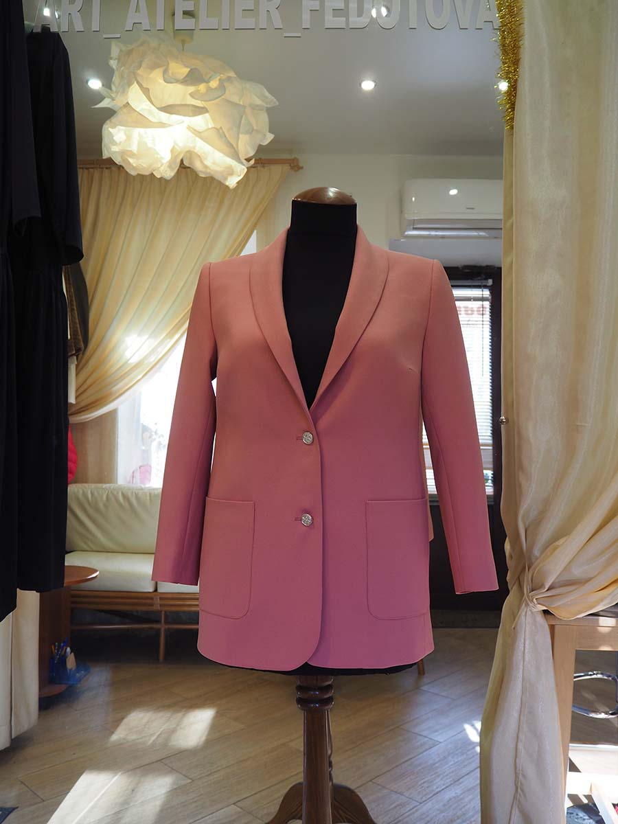 На этот раз мы пошили женский костюм из мягкого габардина нежно-розового цвета для торжественного случая. Классический пиджак на шелковом подкладе с двумя пуговицами и воротником «шалька». Полочка выполнена с подрезным бочком, борт книзу заужен, изготовлены накладные карманы. Брюки классические, длиной семь восьмых, со стрелками.