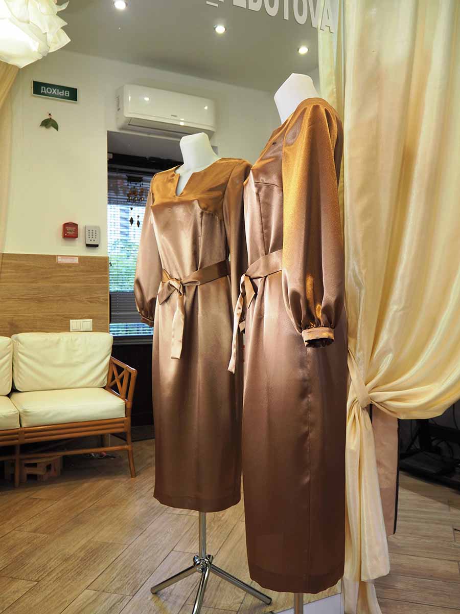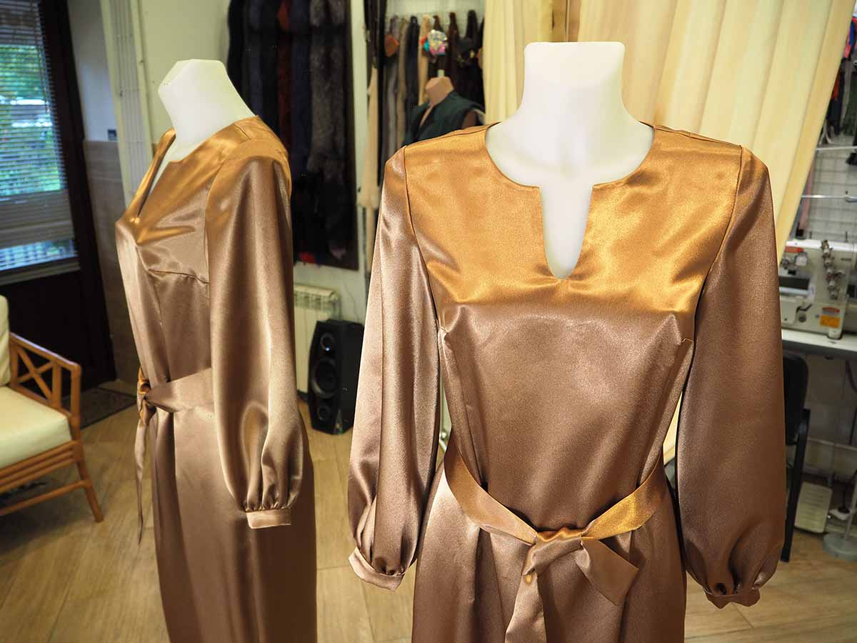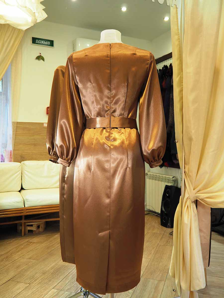 Платье цвета золота прилегающего силуэта с поясом по талии и фигурным вырезом по горловине. Рукав втачной, со сборкой на манжете, придающей рукаву эффект фонарика. По спинке застежка на потайной молнии. Для свободы движений изготовлена шлица.