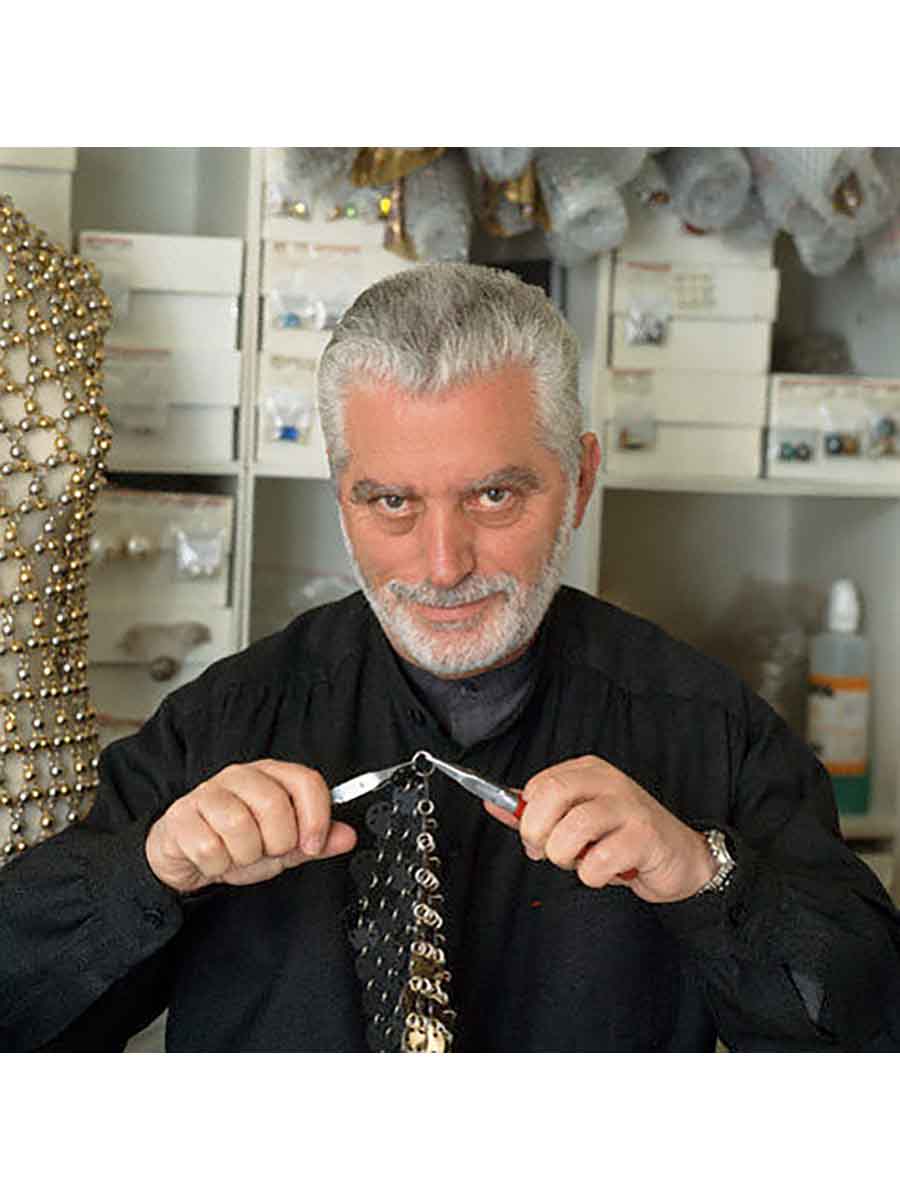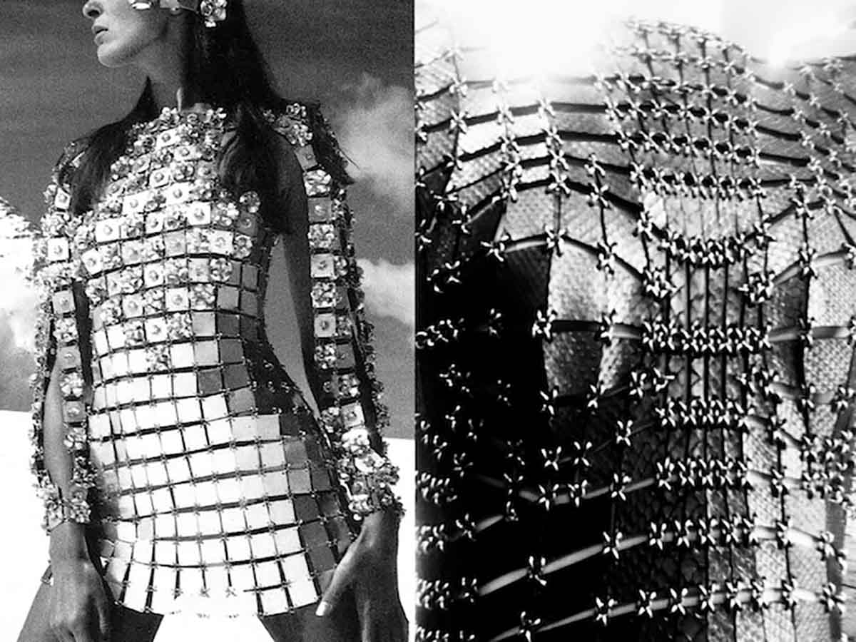 Рабан использовал несколько жестких материалов, которые раньше считались неподходящими для изготовления одежды. С помощью экспериментальной технологии модельер создал современное подобие кольчуги, сияющей и переливающейся так, что происходящее на подиуме скорее напоминало выставку оборудования для космических кораблей, чем модный показ.